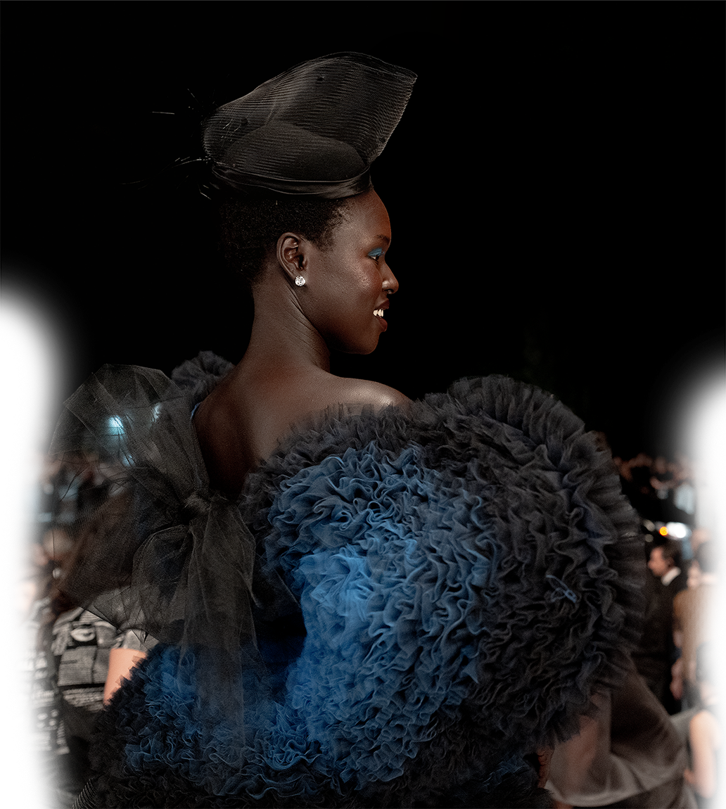 Embodying the Spring Florals theme, a strapless nude gown dusted with sparkling details evokes morning dew on delicate petals. A voluminous gauzy headpiece floats like a blossom in the breeze, transforming the ensemble into a living floral sculpture — romantic, airy and perfectly attuned to the season’s superbloom.